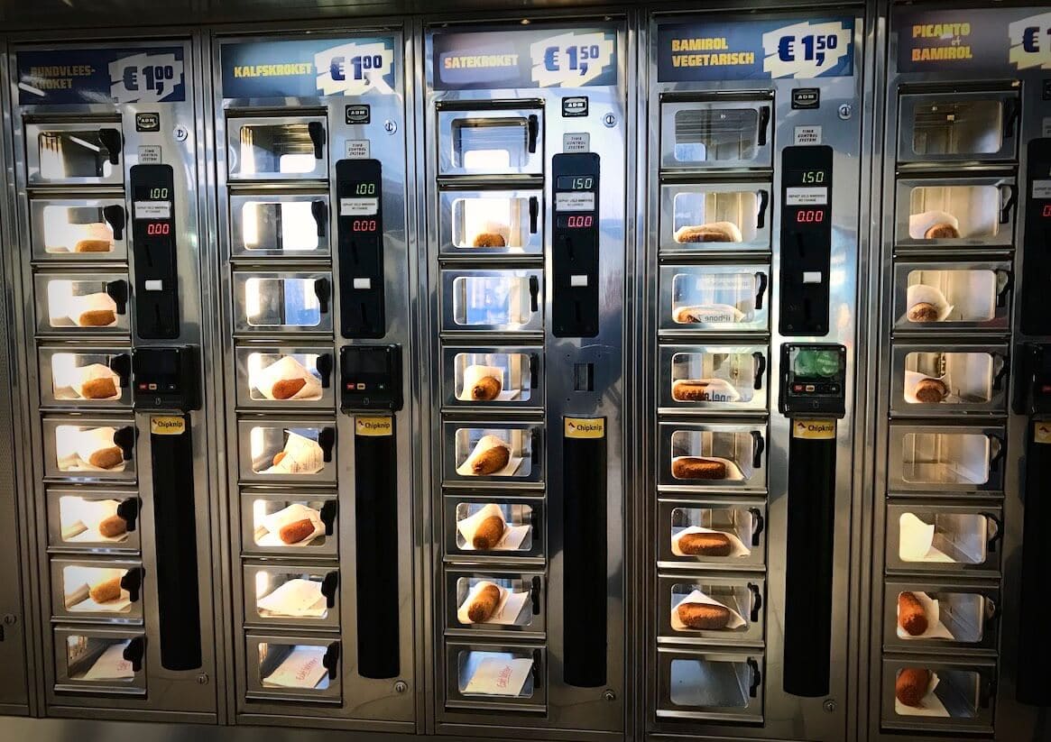 Wenn es besonders schnell gehen muss, oder die Lieblingssnackbar zu hat, kann man Kroketten (und andere Snacks) auch „aus der Wand ziehen“ (niederländisch: uit de muur). Aber auch bei Touristen ist diese Art, niederländische Snack zu probieren, sehr beliebt. Praktischerweise muss man dazu gar kein Niederländisch reden können: Einfach ein paar Münzen in den Schlitz werfen, das Fach öffnen und den Wunschsnack herausnehmen. Bei vielen dieser Snackautomaten kann man inzwischen auch kontaktlos zahlen, an manchen Automaten ist das sogar die einzige Option.
